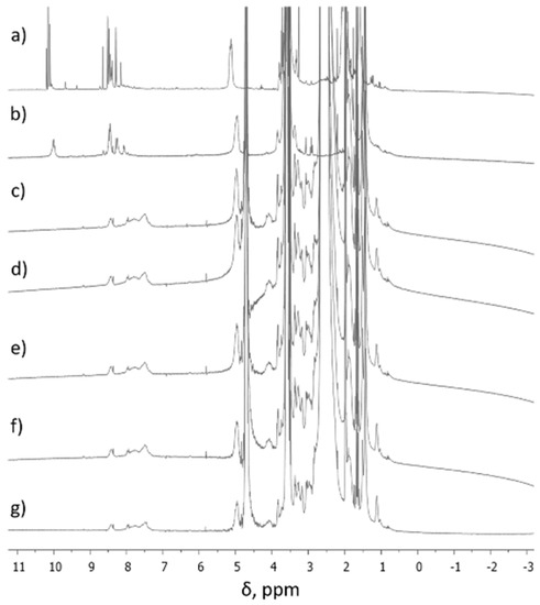 Figure 2a,b shows 1H-NMR spectra (in different solvents) of the first step synthesis when TA interacted with SQ-PEG-NH2 in the 1:1 molar ratio and it was observed that the signal assigned to aldehydes (CH=O) at ~10 ppm was still present, indicating the existence of free carbonyl moieties. A deep introspection on signals at ~10 ppm shows the existence of three different carbonyl moieties (δ = 10.19; 10.15; 10.10 ppm), which were assigned to Ia, Ib, and unreacted carbonyl groups. Subsequent reaction of the intermediate mixture with the established amounts of PEI2000 resulted in total consumption of aldehyde moieties as can be seen in the 1H-NMR spectra, recorded in D2O (Figure 2c–g) and, as a result, the corresponding DCFs are formed.