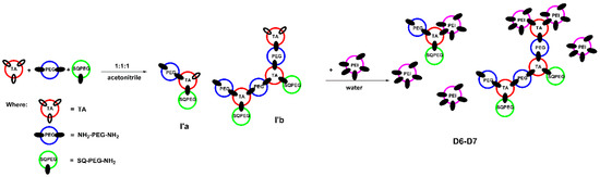 In case of DCFs F6 and F7, the results are similar to earlier described system [34]. As depicted in Figure 3, in the first step, when the ratio of TA:SQ-PEG-NH2:NH2-PEG-NH2 was 1:1:1, TA interacted with SQ-PEG-NH2 and NH2-PEG-NH2, leading to the formation of the mono and di-aldehyde intermediates (I’a and I’b, Figure 3), remarks supported by analyzing the 1H-NMR signals of the TA carbonyl moiety (Figure S1). Subsequent addition of NH2-PEG-NH2 to the composition of DCFs lead to the formation of branched structures (D6–D7, Figure 3). In the following step, when the intermediates were treated with various amounts of PEI2000, the 1H-NMR spectra showed the total consumption of aldehyde groups (Figure S1).