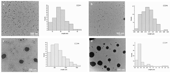 TEM images and corresponding average size distributions of the synthesized DCFs in water: (a) F1 (~30 nm); (b) F2 (~100 nm); (c) F6 (~500 nm); and (d) F7 (~300 nm).