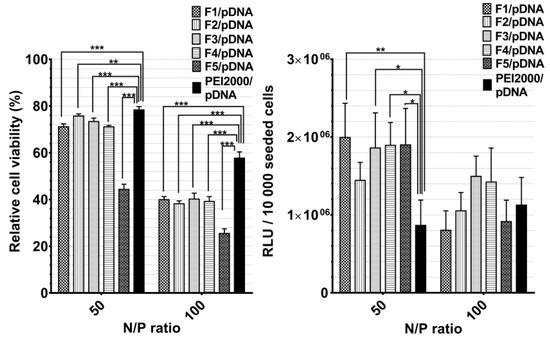 Graphical representation of relative viability and transfection efficiency (relative light units (RLUs)/10,000 seeded cells.) of Hela cells treated with polyplexes at 50 and 100 N/P ratios. The results are presented as a mean value ± the standard deviation (S.D.); n = 5–7. * p < 0.05, ** p < 0.01, and *** p < 0.001 by Student’s t-test.