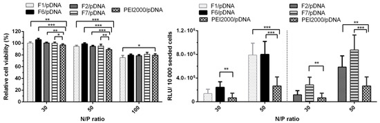 Graphical representation of relative viability and transfection efficiency (relative light units (RLUs)/10,000 seeded cells) of Hela cells treated with polyplexes at 30, 50 and/or 100 N/P ratios. The results are presented as a mean value ± the standard deviation (S.D.), n = 5–7. * p < 0.05, ** p < 0.01, and *** p < 0.001 by Student’s t-test.