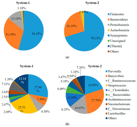 Bacterial community at the phylum level and genus level is shown in Figure 4. At the phylum level, Firmicutes was the most dominant one in both samples, but was considerably higher in relative abundance in the sample from system-2 (54% vs. 70%) (Figure 4a). Firmicutes contains various fermentative bacteria. Bacteroidetes was the second most dominant one in both samples (~30%). In system-2, Actinobacteria was also slightly higher in relative abundance (1% vs. 3%), while the relative abundance of Proteobacteria dramatically decreased (12% vs. 1%).
