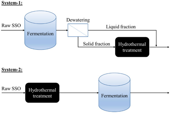 The experimental scheme of this study is shown in Figure 5. In system-1, the raw SSO was first fermented in a semi-continuous process. The fermenter effluent was then centrifuged for 30 min at 5000 rpm using a centrifuge (Sorvall Legend XT centrifuge, Fisher Scientific, Hampton, NH, USA) to separate the liquid and solid fraction of the fermented effluent. Then, the solid fraction of the fermented effluent was subjected to hydrothermal post-treatment. Afterwards, the liquid fraction (that was already separated through centrifugation) was mixed with the hydrothermally post-treated solid fraction to produce the final sample for analysis. In system-2, the raw SSO was first subjected to hydrothermal pre-treatment. Then, the pretreated SSO was used as the feedstock for a semi-continuous fermentation to produce a final sample for analysis.