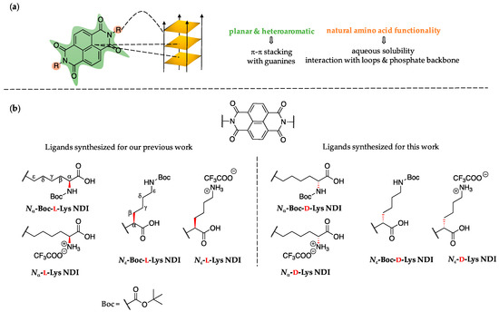 The NDI scaffold is an attractive platform for designing G4 ligands due to the electron-deficient polyaromatic core that can stack on the guanine tetrads. We have chosen lysine (Lys) due to its ideal structural features to interacting with G-quadruplex DNA. Lys functionalization imparts water solubility and positive charges that can interact with the DNA’s phosphate backbone. Our previous work indicated that the length of peripheral substituents played a role in binding [35]. Lys showed best binding (and selective behavior) for certain quadruplexes [35]. The key features that make these NDIs potential G4 DNA binders are highlighted in Figure 2a.