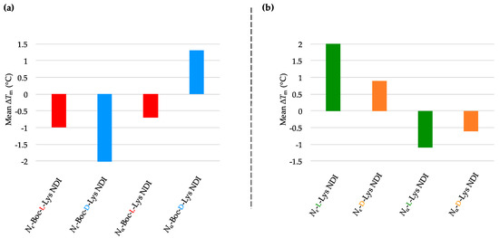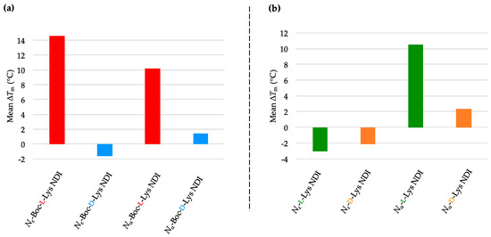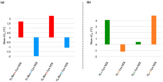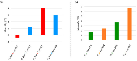 Graphical representations of mean ΔTm values obtained from VT CD studies of h-TELO with 10 equivalents of (a) Nα- and Nε-Boc-l- and d-NDIs as well as (b) Nα- and Nε-l- and d-NDIs.