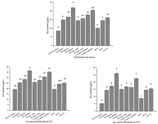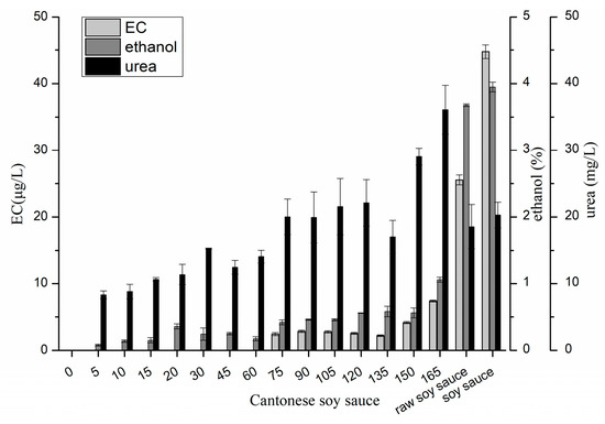 2.2. Changes of EC, Ethanol and Urea in Soy Sauce Produced in Laboratory