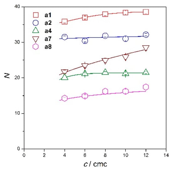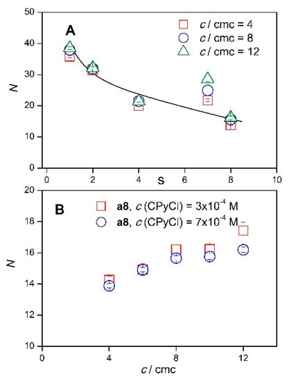Micelle aggregation number values of diamide gemini surfactants with variable spacer length a1–a8 were found to be in the range 15–38, depending on surfactant concentration. As seen from Figure 1, micelle aggregation number values for diamide surfactants a1 to a8 almost do not depend on surfactant concentration c/cmc. This implies the formation of stable spherical micelles with a constant aggregation number for diamide geminis a(s), s = 1-8 in the concentration range 4 × cmc to 12 × cmc. In Figure 2A, the plot of N vs. spacer length s is shown for three different surfactant concentrations c/cmc = 4, 8, 12.
