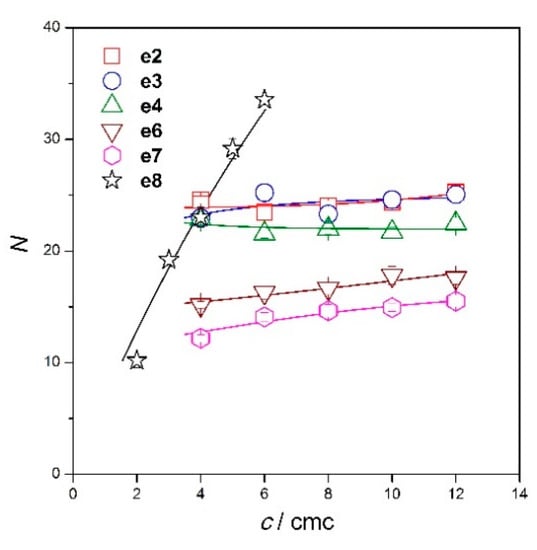 Micelle aggregation number values of e2 to e7 diester surfactants were found to be in the range 12–25 (Figure 3, Table 3). As observed with the a(s) series, the dependence of micelle aggregation number of e2 to e7 gemini surfactants on concentration c/cmc is again moderate, which implies the presence of stable spherical micelles for this range of spacer lengths. A different aggregation behaviour was observed for gemini molecules with the longest spacer e8, where a steeper increase of micelle aggregation number with surfactant concentration occurs (Figure 3). It results from the plot that the maximum micelle aggregation number is equal to 33 (Table 3), was reached for e8 at just a concentration 6 × cmc which is half of the maximum concentration 12 × cmc of other diester gemini surfactants e(s).