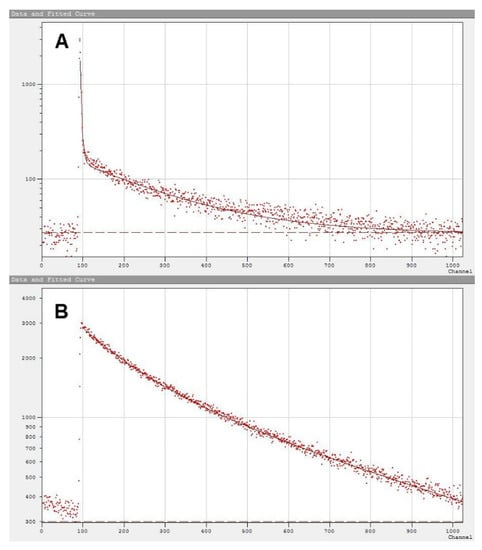 The fluorescence decay curves were recorded using the lifetime fluorescence spectrometer LifeSpec II (Edinburgh Instruments, Edinburgh, UK) at 340 nm excitation wavelength and 381 nm emission wavelength. The kinetic model of time-resolved fluorescence quenching considers that the non-exponentiality observed in the fluorescence decay is the result of the fact that each micelle does not contain an identical number of molecules of quencher. Instead, the quenchers are distributed over micelles according to a Poisson distribution. In the absence of quencher, the excited probe decays with a rate constant k = 1/τ0. The decay curve is single exponential for pyrene as the fluorescence probe. The presence of quencher affects the decay curve which is no longer single exponential and obeys the equation [34,35]: