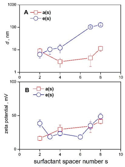Mean micelle hydrodynamic diameter of both series of gemini surfactants a(s) and e(s) was determined utilising dynamic light scattering method and is plotted in Figure 5A as a function of surfactant spacer number s. The surfactant concentration for all samples was 6 × cmc.
