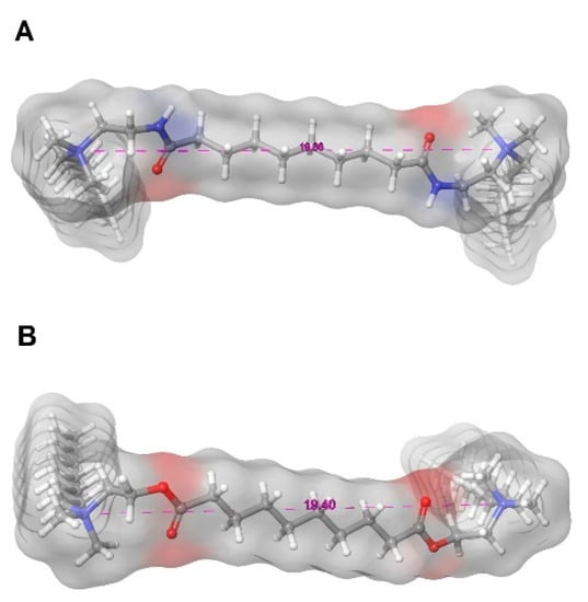 Optimised 3D conformers of a8 and e8 gemini molecules were constructed and are shown in Figure 7. Calculated N-to-N longitudinal size and van der Waals surface of a8 and e8 hydrophilic molecule parts are given in Table 4.