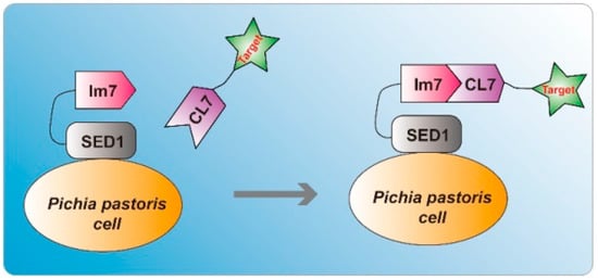 Schematic illustration of the indirect P. pastoris surface display system through the ultra-high-affinity interaction between Im7 and CL7. The Im7-SED1 fusion proteins are expressed and displayed on the surface of P. pastoris cells. The addition of CL7 tagged proteins leads to the indirect display of target proteins.