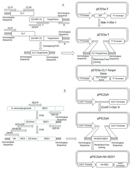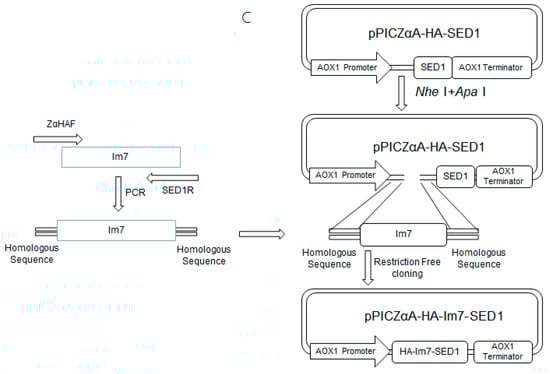 Schemes for the construction of plasmids including (A) pET23a-CL7-sfGFP, pET23a-CL7-mCherry, pET23a-CL7-huArg I; (B) pPICZαA-HA-SED1; and (C) pPICZαA-HA-Im7-SED1.