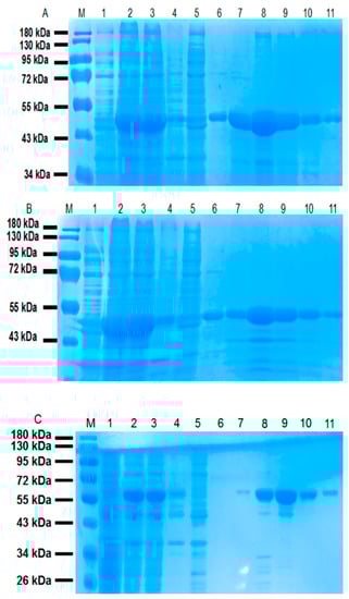 SDS-PAGE analysis of the (A) CL7-sfGFP, (B) CL7-mCherry and (C) CL7-huArg I fusion proteins purified by Ni-NTA. M: protein ladder (Thermo Scientific, Product# 26616); Lane 1: E. coli cells without IPTG (Isopropyl β-d-Thiogalactoside); Lane 2: E. coli cells induced with 1 mM IPTG; Lane 3: supernatant after sonication; Lane 4: debris after centrifugation; Lane 5: flow-through of supernatant after binding with Ni2+-resin; Lane 6: flow-through of Ni2+-resin washed with 20 mM imidazole; Lane 7 to Lane 10: elution of 4mL TBS (tris-buffered saline) containing 50 mM, 100 mM, 150 mM and 200 mM imidazole, respectively; Lane 11: the resin resuspended in 4 mL TBS.