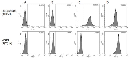 Flow cytometry analysis of P. pastoris cells including (A) unlabeled GS115/pPICZαA, (B) GS115/pPICZαA, (C) GS115/pPICZαA HA-SED1 and (D) GS115/pPICZαA HA-Im7-SED1. All the cells except (A) were treated with DyLight 649-conjugated goat anti-mouse IgG(H+L) antibodies (top line) and with CL7-sfGFP and mouse anti-HA tag monoclonal antibodies (bottom line).