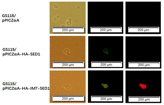 The plasmids pPICZαA-HA-Im7-SED1 and pPICZαA-HA-SED1 were digested with Pme I and transformed into the GS115 electrocompetent cells according to the manual. Transformants were isolated by incubation at 28 °C for 48 h on YPD plates supplemented with 100 μg/mL of Zeocin. Then, five to 10 single colonies of transformants were inoculated in 20 mL of BMGY in 250 mL flasks and cultivated at 28 °C under 200 rpm. After 24 h, the cells were centrifuged at 5000× g for 5 min, resuspended in 20 mL of BMMY medium containing 1% (v/v) methanol and continued to grow at 28 °C, 200 rpm for 24 h.