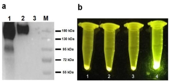 The display of HA-SED1 and HA-SED1-Im7 proteins on the surface of P. pastoris cells (Figure 6a, lane 1 and lane 2) were validated by western-blot with HA specific antibodies. As a control, no bands were detected for GS115/pPICZαA cells (Figure 6a, lane 3). The observed molecular weights of HA-SED1 and HA-Im7-SED1 were around 180 kDa, which are both much higher than the anticipated values (36 kDa for HA-SED1 and 45 kDa for HA-Im7-SED1), possibly due to the glycosylation of these SED1 fusion proteins. Under the blue light transmitter (Figure 6b), the GS115/pPICZαA HA-Im7-SED1 cells incubated with CL7-sfGFP showed a very bright green (Figure 6b, tube 4). In contrast, the GS115/pPICZαA HA-SED1 cells in the presence or absence of CL7-sfGFP (Figure 6b, tube 1 and 2), as well as the GS115/pPICZαA HA-Im7-SED1 cells (Figure 6b, tube 3) in the absence of CL7-sfGFP did not show green fluorescence.