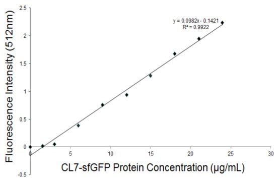The calibration curve and linear regression equation of the CL7-sfGFP fusion proteins in TBS buffer (pH 7.6).