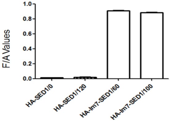 Different amounts of CL7-sfGFP fusion proteins were added into 0.5 mL of the GS115/pPICZαA-HA-Im7-SED1 cells (Table 1). Then, 120 μg of CL7-sfGFP fusion proteins were also added into 0.5 mL of the GS115/pPICZαA-HA-SED1 cells. These cells were incubated at room temperature with rotation for 1 h and were then washed five times with TBS and resuspended in 1 mL of TBS. The GS115/pPICZαA-HA-Im7-SED1 and GS115/pPICZαA-HA-SED1 cells were diluted. Their fluorescence intensities and OD600 were examined and shown in Table 1. In addition, the fluorescence intensity/OD600 (F/A) values were analyzed with GraphPad Prism 5 and are given in Figure 9.