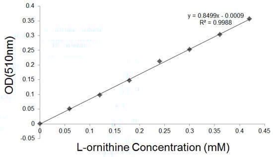 The l-ornithine concentration was detected using the colorimetric assay [16], resulting in a calibration curve shown in Figure 10. According to the fluorometric assay results above, we found that ~20.9 μg CL7-huArg I (52.2 kDa) CL7-sfGFP per 1 g dry yeast cell was immobilized on the yeast surface. After enzymatic reactions, the l-ornithine contents in supernatant were analyzed. One unit of enzyme activity is defined as the activity of enzyme that produced 1 μmol of l-ornithine in 1 min. As a result, the activity of free CL7-huArg I is 504.5 U/mg and the activity of displayed enzymes is 261.3 U/mg, indicating that ~50% enzyme activity can be retained after immobilization. The activity of CL7-huArg I that was immobilized by dry yeast cells is 5045 U/g.