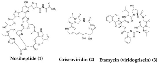 Their structures were elucidated by various spectroscopic analyses including NMR experiments (Figures S1–S6). Based on reference data described in the literature [19,20,21], compounds 1, 2, and 3 were identified as nosiheptide, griseoviridin, and etamycin (viridogrisein), respectively (see details in the Supplementary Information).