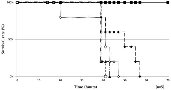 - Hamamoto, H.; Kurokawa, K.; Kaito, C.; Kamura, K.; Manitra, R.I.; Kusuhara, H.; Santa, T.; Sekimizu, K. Quantitative evaluation of the therapeutic effects of antibiotics using silkworms infected with human pathogenic microorganisms. Antimicrob. Agents. Chemother. 2004, 48, 774–779. [Google Scholar] [CrossRef]