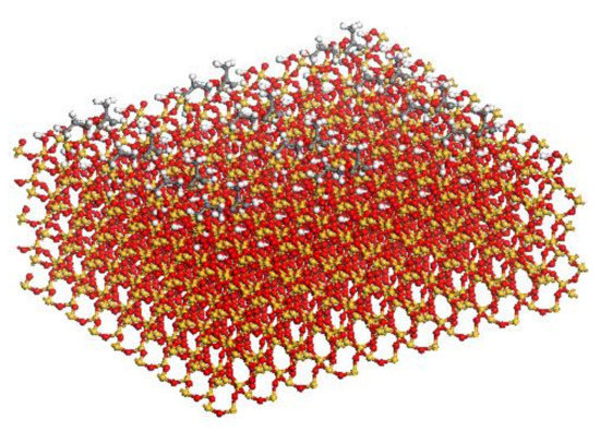 The PE box is further extended to 1100 Å in the z-direction to reduce the interaction between different boxes in the 3D periodic boundary condition [9]. PE is built above S with a space of 0.5 nm [8]. The interface model is heated up to 500 K for 500 ps, and cooled to 300 K with a cooling rate of 0.2 K/ps, and then relaxed at 300 K for further 15 ns using the NVT ensemble. The average result for the last 1 ns is calculated for the interface energy. The PE(x − y)/S, PE(x − y)/mS1 and PE(x − y)/mS2 represent the equilibrated interface models of neat silica, A174-modified silica and A2783-modified silica combined with PE chains, respectively. Here, x is the chain length and y means the number of PE chains [18]. The PE(76-40)/mS1 interface model is exhibited in Figure 3.