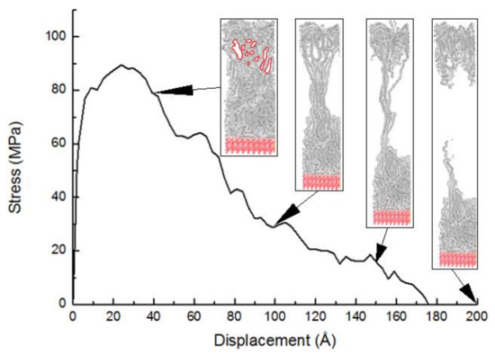 The tensile stress-displacement curve of PE(150-40)/S deformed at 300 K is exhibited in Figure 5. The curve at the low displacement or elastic region is ascending. After a maximum stress at the yield point, the stress is decreased due to raising the free volume needed for the atomistic motions under chain slipping, which shows a post-yield region. Finally, the stress becomes 0 and the failure happens. The MD simulations capture the detailed fracture process at the atomic scale. During the increase of the normal traction, the PE chains are stretched upward. As the normal strains increase, small voids quickly appear in the PE. The stress drop in Figure 5 around the separation displacements of 27 Å is caused by the separation among the PE chains. The separation is caused by the weak interaction of the van der Waals interactions acting between the chains. The post-yield behavior is exhibited by debonding between the chains, chain slipping, and disentanglement extending to an ultimate failure mode. The void formation is initiated in the regions of the polymer chains with weaker intermolecular interactions and less entanglement. The layering behavior may considerably change the physical properties of the polymer chains at the interface in comparison to the chains in the bulk region. The initial growing void is created far away from the interface layered zone, which is illustrated as a red circle in Figure 5. These voids become bigger and coalesce when the elongation further continues. The load transfer in graphene/carbon nanotube/PE hybrid nanocomposites via MD simulation was investigated and it was found that the first damage in PE/graphene interface was also observed in the PE bulk [36]. As the separation increases further, the void increases and the column becomes thinner at the displacement of 100 Å. At a separation of around 150 Å, a long and thin PE column emerges, connecting the top and bottom groups of the PE. Thereafter, the polymer chains are being pulled out from their starting configurations at the same time. The failure caused by the breakdown of nonbonded interactions in the PE bulk results in the cohesive failure mode at the displacement of 175 Å. As the disconnected chains in the column are attracted to the top and bottom groups, the column disappears, and the PE binder is separated by half.