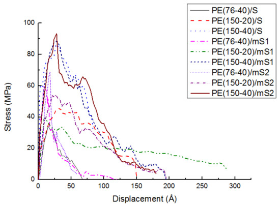 The effect of PE chain length, number and coupling agents on the tensile stress-displacement simulation is studied at 300 K in Figure 7. The curves show large fluctuations, especially for chains with 150 carbon atoms. The maximum stress and the corresponding distance at the maximum stress in different cases are illustrated in Table 2. The maximum stress reaches 34.2 MPa and 86.3 MPa for PE(76-40)/S and PE(150-40)/S, respectively. The separation displacement is 15 Å and 27 Å, respectively, when the maximum stress occurs. It means that with a longer chain length, the maximum stress and corresponding displacement increase. The maximum stress reaches 42.8 MPa and 86.3 MPa for PE(150-20)/S and PE(150-40)/S, respectively. The separation displacement is 26 Å and 27 Å, respectively, when the maximum stress occurs. It means that with a larger chain number, the maximum stress and corresponding displacement also increase. The rise of separation displacement and maximum stress is caused by the entanglement. This behavior can be ascribed to increasing the chain tangling probability of the chains, which consequently improves the adhesion properties due to the greater energy dissipation. The lower chain length and number decrease the chain entanglement and the resistance of the polymer chains against deformation in the interface tensile process.