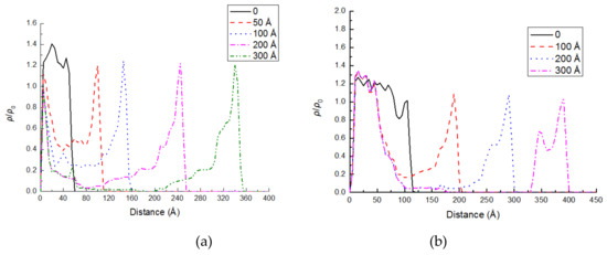 Figure 8a,b show the density profile of PE(150-40)/S and PE(150-40)/mS1 interface at different stretching distances, respectively. In Figure 8a, the density profile reaches to zero value while the peaks in the vicinity of the S layer are very narrow when the displacement is 300 Å.