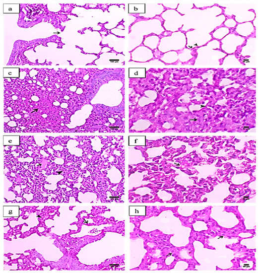 Figure 1a,b presents the histopathological examination of the lung tissues of normal control mice, showing normal bronchial and alveolar tissues. The bronchi exhibited a normal cuboidal epithelium that ended with a terminal bronchus that communicated directly with the respiratory portion. The respiratory portion consisted of many alveoli that were lined with two types of alveolar epithelial cells, type I pneumocytes (flattened epithelial cells), and type II pneumocytes (mostly cuboidal cells). The lung tissues of mice injected with PQ showed necrosis of the epithelium lining the bronchus, associated with hyaline membrane formation. The lesions were mostly peribronchial in nature. Moreover, the peribronchial areas revealed marked lymphoid hyperplasia, with the collapse and atelectasis of the neighbouring peribronchial alveoli. The alveolar space was decreased due to marked alveolar tissue necrosis, mixed cellular infiltration, and vascular exudate. The interstitial tissue revealed marked thickening, associated with septal cell proliferation, as well as mononuclear inflammatory cell infiltration. The alveolar lumen was also decreased due to the formation of eosinophilic hyaline membranes, as shown in Figure 1c,d.