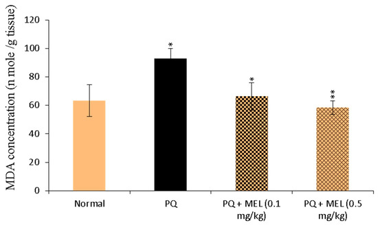 Lipid peroxidation is associated with several harmful effects, such as increased membrane rigidity and reduced mitochondrial survival [60]. One of the most commonly used indicators of lipid peroxidation is MDA, the product of lipid peroxidation. Our study revealed that MDA levels in the lung tissue homogenate were significantly increased in PQ-injected mice compared to those in the control group. These results are consistent with previously reported studies [61,62]. PQ induces the accumulation of free radicals, which leads to lipid peroxidation and the overproduction of oxidation markers such as MDA [63,64]. Our results demonstrated that compared to the control, MEL significantly reduced this elevated MDA production. MDA can indirectly reflect the degree to which ROS attack cells in the lung tissue and the antioxidant ability of the body. Therefore, we suggest that MEL decreased lipid peroxidation through its ability to effectively reduce MDA levels.