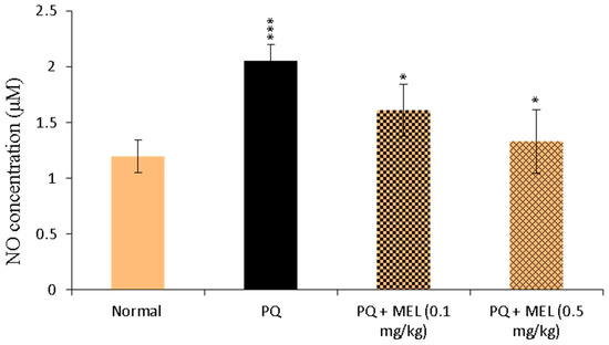 NO is a reactive nitrogen species (RNS) and mediates nitrative stress via the nitration of proteins, lipids, and nucleic acids [45,65]. It has been reported that RNS are involved in PQ-mediated lung injuries, accompanied by augmented NO production, in experimental animals injected with PQ [66,67,68,69,70]. These findings are consistent with the results of our study, which showed that PQ significantly increased NO production, which highlighted the pathophysiological importance of NO in PQ-mediated lung injuries. In contrast, treatment with MEL significantly reduced NO production in PQ-exposed mice, which explains the ability of MEL to reverse the effects of PQ-induced NO production in lung tissues. The lung contains a group of antioxidant enzymes, including SOD, CAT, and GPx.