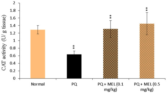 As presented in Figure 5, the activity of CAT in the lung tissue homogenate was significantly reduced in the PQ group compared to that in the control group. Compared to PQ alone, MEL treatment induced a significant increase in CAT activity, especially in the PQ + MEL (0.5 mg/kg) group.