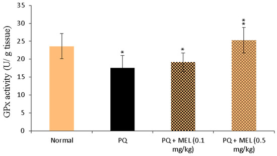 The measurement of lung antioxidant GPx levels showed that PQ reduced GPx levels, as indicated in Figure 6. However, the administration of MEL significantly increased the GPx level in the lung homogenate compared to that in the PQ group.