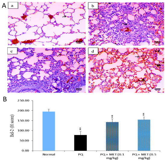 Apoptosis plays a crucial role in wound repair and in lung epithelial injuries that lead to fibrosis. Markedly increased alveolar epithelial cell apoptosis has been reported in lung fibrosis [76,77]. Similarly, previous studies showed the role of decreased Bcl-2 expression in increasing epithelial cell death and the role of increased Bcl-2 expression in resistance to apoptosis [78]. Our results showed that the administration of PQ caused a significant reduction in Bcl-2 protein levels and that treatment with MEL increased these reduced Bcl-2 levels. Our findings were consistent with other studies, showing the ability of high levels of the anti-apoptotic protein Bcl-2 to prevent apoptosis in lung fibroblasts [79,80,81].