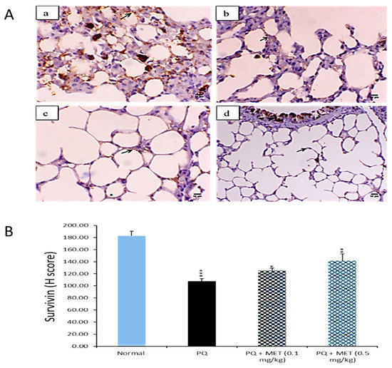 Survivin is a protein that inhibits apoptosis and promotes cell proliferation [49]. Compared to levels in the control group, the survivin level was significantly (p < 0.001) declined in injured lung tissues after PQ injection. In contrast, survivin levels elevated in mice injected with PQ followed by MEL treatment. A high dose of MEL significantly (p < 0.01) augmented survivin levels, with an effect stronger than that observed in the other groups (Figure 8).