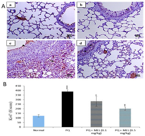 Lung fibrosis is characterized by fibroblast proliferation and extracellular matrix remodeling, which leads to respiratory failure [50]. Figure 9 reveals that PQ significantly (p < 0.01) elevated the expression level of Ki-67 in lung tissues compared to those in the control group. Treatment with either a low or high dose of MEL can decrease these elevated Ki-67 levels. MEL (0.5 mg/kg) significantly (p < 0.01) decreased the expression of Ki-67, with an effect stronger than that observed in the other groups.