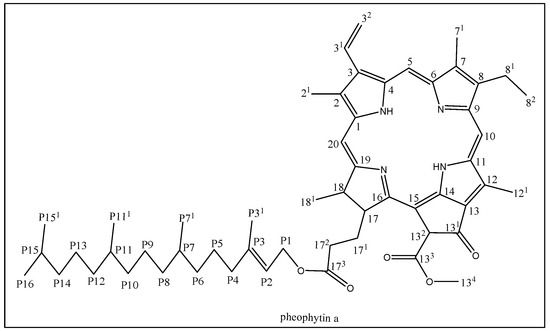 Chlorophylls which constitute the most abundant pigments in plants, play a major role in the plant and algae photosynthesis processes. Chlorophylls a and b, and their de-magnesium analogues, pheophytin a (pheo-a) and pheophytin b, respectively, are common chlorophylls in plant [6]. Pheo-a is a porphyrin macro-cyclic derived molecule consisting of four pyrrole rings connected together through methylene bridge with a phytyl side change linked to the macocyclic structure at carbon 173 through ester linkage [7] (Figure 1). Pheo-a is a dietary chlorophyll present in the edible green plants and algae and constitute the main pigment present in known healthy, edible plants, e.g., the olive oil color is mainly due to pheo-a [8]. In addition, virgin olive oil withstands oxidation due to the presence of pheo-a [9]. Biological activities, such as anti-inflammatory [10], antimicrobial [11], antigenotoxic [12], and anti-hepatitis C virus [13], have been reported for the pheo-a compound.