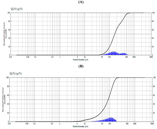 Pheo-a EC microparticles were formulated to give a stable suspended solution. The system showed no visible coalescence. Collectively, these results indicated a significant difference from phoe-a itself. Pheo-a has no solubility and is completely immiscible in water. However, the formulated microparticles are completely dispersed in water. The entrapment of pheo-a in the EC particles was confirmed by changing the EC particles to a green color, the color of pheo-a. The particles size was decreased from 163 ± 1.5 µm for plain EC (Figure 2A) to microparticles 139.23 ± 0.8 µm after the formation of EC- pheo-a (Figure 2B); this result is due to the uniformity of the formulated particles, which showed only one peak. The plain microparticles were heterogenous and showed two different peaks, while the microparticles that loaded pheo-a showed homogeneity in the formulation in the form of only one peak and without any aggregation. The obtained result is considered an intensity-weighed value and a sensitive method for the formulated larger size types. This result may be mainly important for aggregated or adulterated models but is also of concern for broadly non-homogeneous examples. For evaluation, the plain EC-microparticles and the pheo-a microparticles were used as size standards with a typical size distribution, which indicates a homogeneous sample [26,27,28]. After purification, the particles were found to be stable without aggregation, and the formulated particles were found also to be reasonably stable in size and didn´t form aggregates. The microparticles were spherical in shape and had a particle size of ≈163–149 µm.