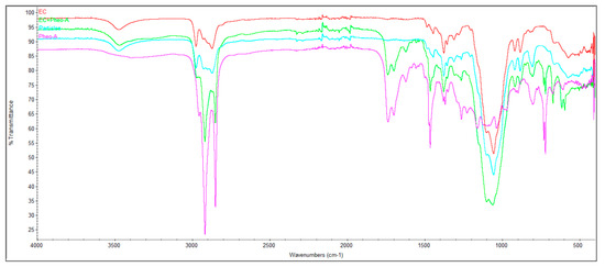 FTIR can be used to measure the functional groups of the polymers and drugs [21,42]. The FTIR spectrometer (BRUKER Company, OPTIK GmbH, Germany) was used to identify the compatibility of all materials together. FTIR can record if an interaction between the EC and pheo-a, which prevented the release of pheo-a from EC [15]. The samples were put in an FTIR instrument under a spectrum from 4000 to 400 cm−1 using attenuated total reflection Fourier transform infrared spectroscopy (ATR-FTIR).