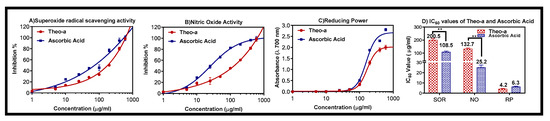 When arginine was metabolized to citrulline with the aid of nitric oxide synthase, NO was produced in biological tissues [45,46]. The formation of the nitric oxide free radical activity was carried out by adding 2 mL of sodium nitroprusside solution (10 mM) to 0.5 mL of a phosphate saline buffer (pH 7.4) with 0.5 mL of the sample at different strengths (0.2–0.8 mg/mL). Additionally, the blend was incubated at 25 °C, followed by a removal of 0.5 mL of the incubated solution, which was mixed with 0.5 mL of Griess reagent ((1.0 mL sulfanilic acid reagent (0.33% in 20% glacial acetic acid at 25 °C for 5 min with 1 mL of naphthyl ethylenediamine dichloride (0.1% w/v)). Then, the absorbance was measured at 546 nm [34]. Finally, the nitric oxide radical inhibition amount was estimated using the following equation: