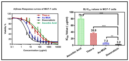 Dose-response curve (A) and half maximal inhibitory concentration (IC50) values (B) of pheophytin a (pheo-a) in Michigan Cancer Foundation 7 (MCF-7) cells in comparison to doxorubicin, ascorbic acid, and gold coated mercaptoundecanoic acid (AU-MUA). All the values are expressed as mean ± standard deviation; n = 3, *** p < 0.001, and ** p < 0.01.
