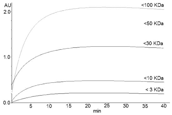 Kinetics of the DMAC reaction of permeates obtained by fractionating the cranberry extract A3. Permeates were obtained by molecular sieves with cut-offs of 3, 10, 30, 50, and 100 kDa.
