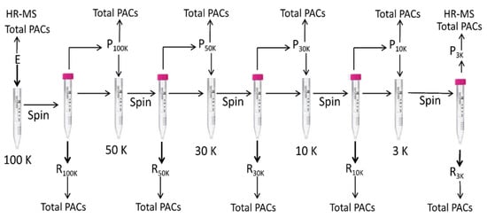 Fractionation of the proanthocyanidins (PACs) by centrifugal filter devices. The extract solution was centrifuged at 4000× g by a centrifugal filter device containing an ultracel-PL PLHK 100 kDa regenerated cellulose membrane, which allowed the ultrafiltration into the lower chamber (permeate) of substances with MW < 100 kDa. Substances with MW > 100 kDa were collected in the upper chamber (retained). Permeate was then loaded on a 50 kDa filter and centrifuged at 4000 × g until the solution passed completely through the filter. The procedure was repeated on 30, 10, and 3 kDa filters. Permeates and retained fractions were analyzed by the DMAC assay, and the permeates less than 3 kDa were analyzed by UHPLC-DAD-HR MS.