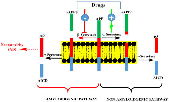 The process of Aβ formation and therapeutic targets are depicted in Figure 2. APP is processed in neuronal cells through two pathways: the amyloidogenic and non-amyloidogenic pathways. The non-amyloidogenic pathway representing the normal physiological process includes the enzymatic action of α-secretase and γ-secretase, leading to the formation of peptide-soluble amyloid precursor protein α (sAPPα), amyloid precursor protein intracellular domain (AICD), and p3. On the other hand, the amyloid pathway involves the sequential cleavage of APP by β-secretase (BACE-1: β-site amyloid precursor protein cleaving enzyme 1) and γ-secretase to yield Aβ (predominantly Aβ40 and Aβ42). Theoretically, drugs that enhance the activity or expression level of α-secretase, or those downregulating the expression level of β-secretase or enzyme inhibitors could be seen as potential therapeutic agents for AD. This is also the area of frustration for the failed clinical trials of drugs such as Lanabecestat [12] and is the basis for the current pessimism in this therapeutic approach. There are still ongoing phase II/III clinical trials on BACE-1 inhibitors and perhaps we should wait to see their outcomes before making firm conclusions on the merit of this therapeutic targeting.
