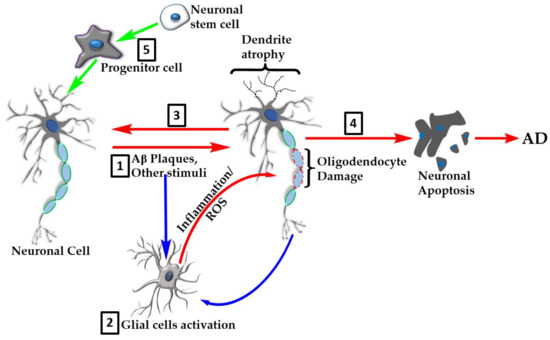 Along with the intraneuronal NFT and extracellular plaques, the classical feature of AD published by Alois Alzheimer in 1907 included morphological changes in microglial cells. An English translation of this account is available [44], though a plethora of more than a century research since then has firmly established glial cells as the major modulators of the inflammatory component of neurodegenerative diseases in the CNS. One reasonable thought in the AD therapeutic approach is thus to shift from the neuronal cells themselves to induction of neuroinflammmation by the primary immune cells in the brain, glial cells, such as astrocytes, microglia, and oligodendrocytes. Stressing the genetic alteration/mutation of genes associated with AD, such as apolipoprotein E (APOE), apolipoprotein J (APOJ), and sortilin-related receptor L (SORL), that are located in glial cells, and with inflammation being an integral part of AD, the literature in this field has expanded explosively in recent years. Genetic alteration, such as that the ApoE, is also regarded as the major risk factor for developing late-onset AD [45].