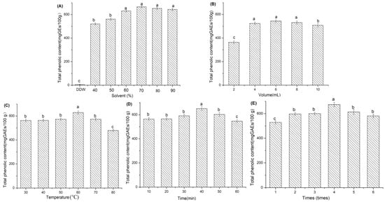 2.1. Effects of Different Extraction Conditions on the Total Phenolic Compounds Isolated from Baijiu Vinasse