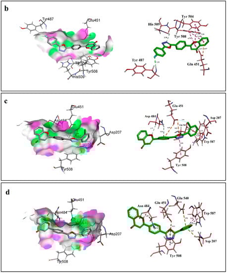 The least active compound 19 (IC50 = 42.30 ± 0.80 µM) among the series failed to form many interactions as those made by active compounds including conventional hydrogen bonding and halogen bonding. It was involved in forming carbon hydrogen and π-Donor hydrogen bond with Asn 484 as formed by compound 3 but with one longer bond distance i.e., 2.89 Å and 3.2 Å. Other interactions resulted between compound 19 and Asp 207, Glu 451, Tyr 508, Glu 540, Trp 587 of the side chain were π-Anion (3.87 Å), π-Anion (4.11 Å), π-π Stacked (4.27 Å), π-Anion (3.51) and π-π T-shaped (5.19 Å and 5.29 Å) respectively (Figure 3d).
