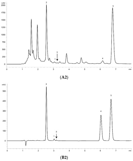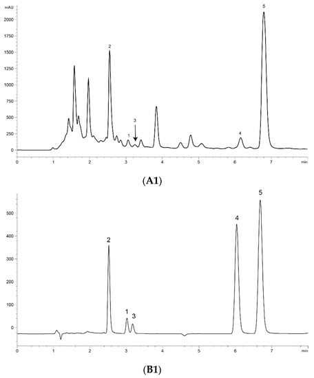 Ultra-performance liquid chromatography (UPLC) chromatograms of the extract of Artemisia annua L. (A. annua) (A) and a standard mixture (B). (A1) (B1) at 191 nm and (A2) (B2) at 206 nm. (1) Artemisinin (Art); (2) arteannuin B (Art B); (3) arteannuin C (Art C); (4) dihydroartemisinic acid (DHAA); and (5) artemisinic acid (AA).